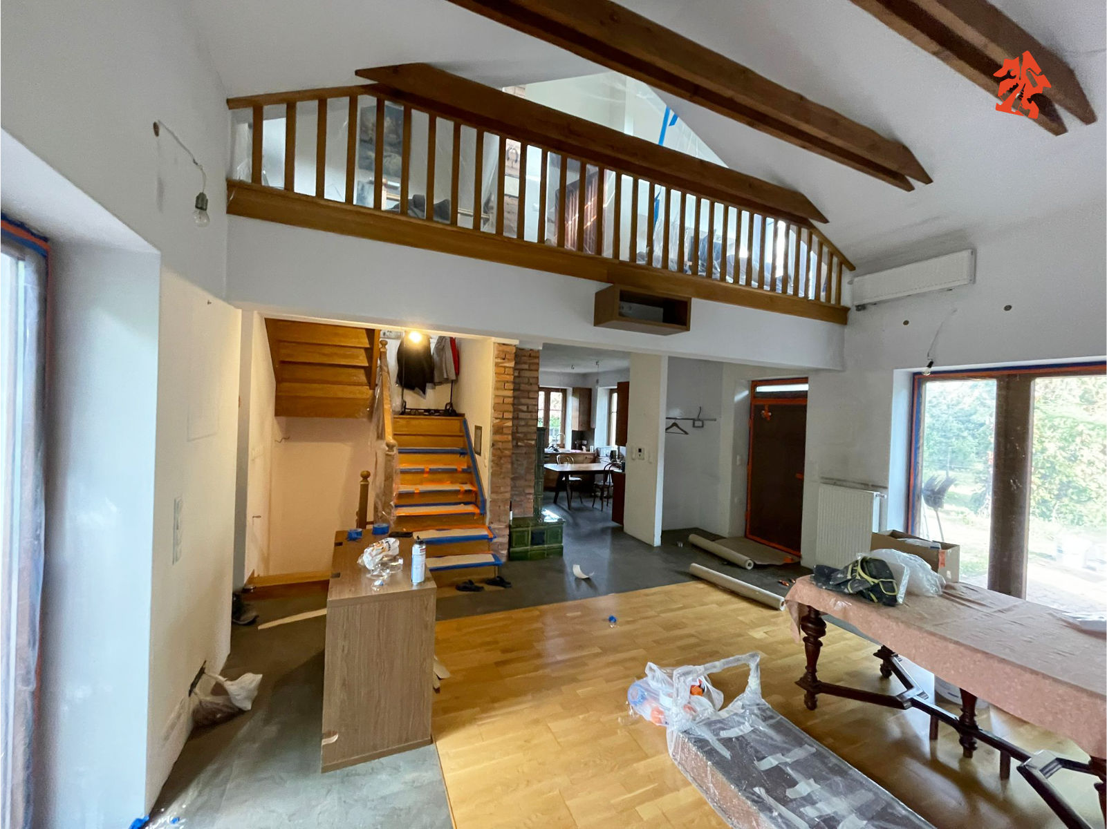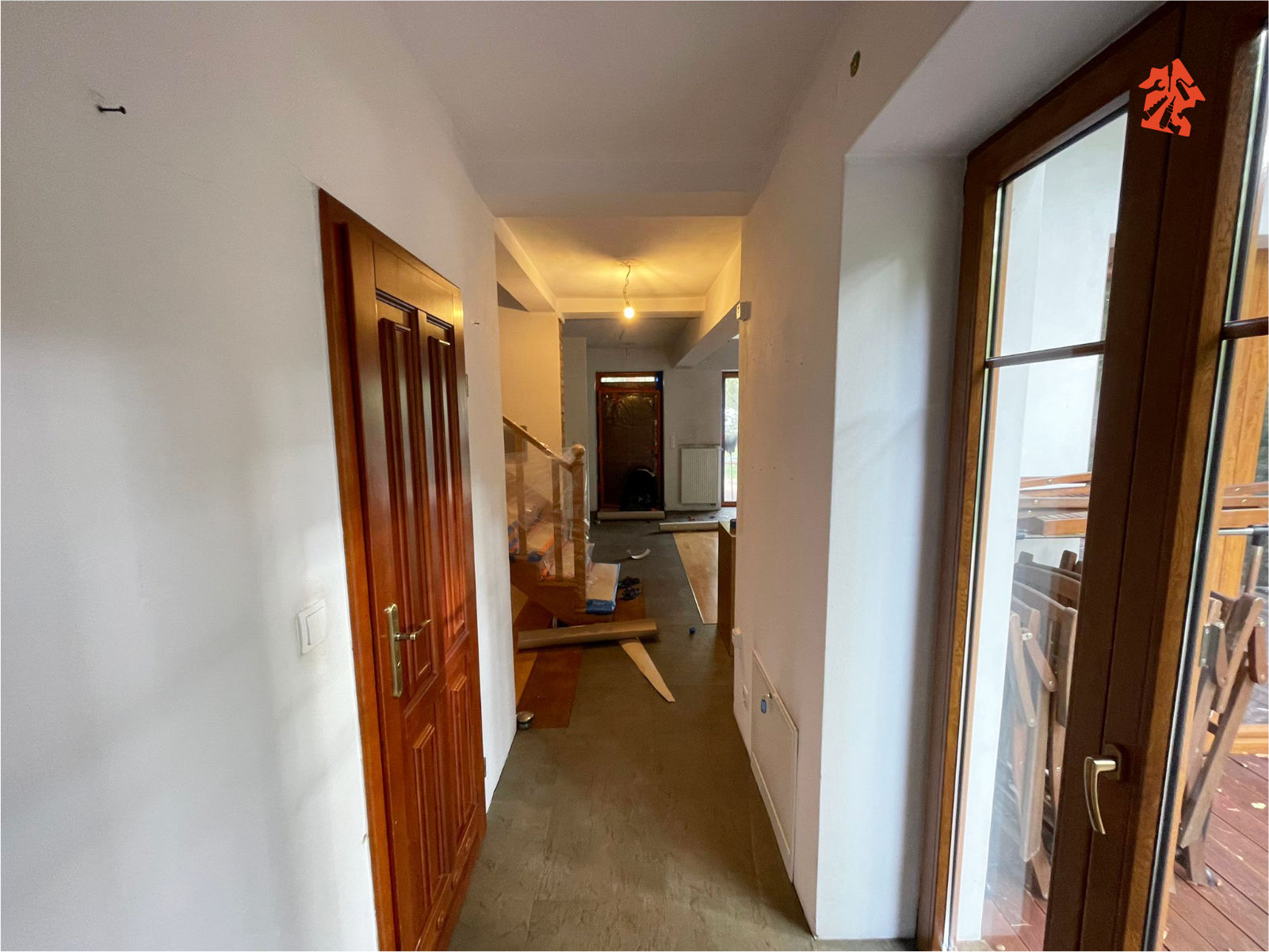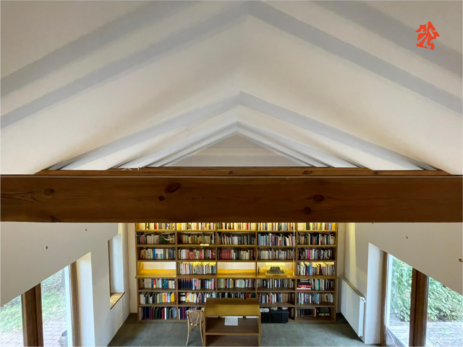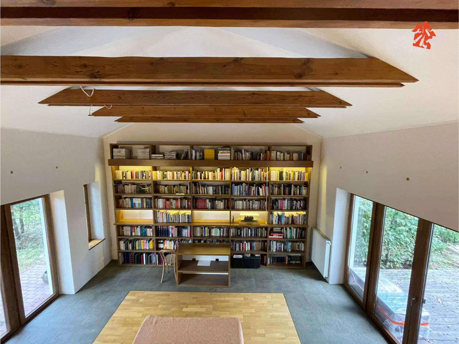 Pierwszym krokiem było odświeżenie salonu z dużą biblioteczką. To pomieszczenie ma wyjątkowy klimat dzięki drewnianym belkom na suficie, przeszklonym drzwiom tarasowym i imponującej ścianie z książkami. W ramach prac wykonaliśmy drobne naprawy ścian, malowanie oraz wymianę oświetlenia. Zadbaliśmy o to, by światło podkreślało półki z książkami – ciepła barwa LED-ów pięknie wydobywa kolory opraw i tworzy przyjemną, kameralną atmosferę. Drewniane elementy konstrukcyjne zostały oczyszczone i zabezpieczone, co pozwoliło zachować ich naturalny urok. Parkiet został odświeżony i zaolejowany, dzięki czemu nabrał głębi i ponownie stał się ozdobą wnętrza.