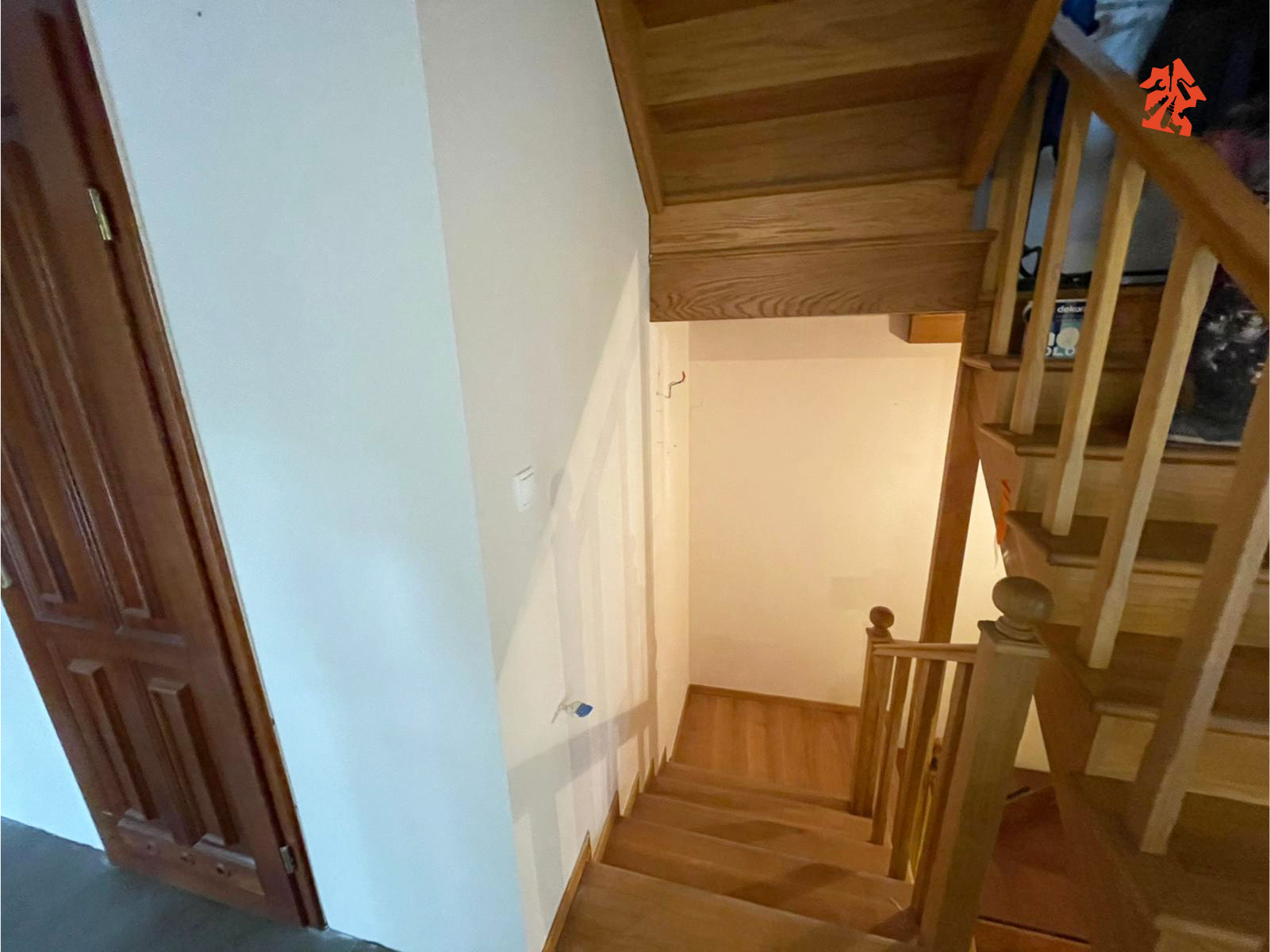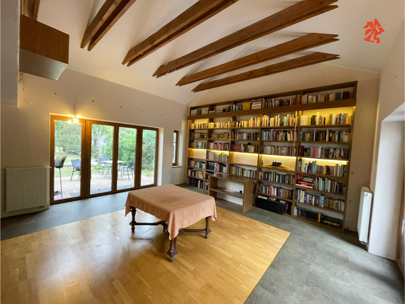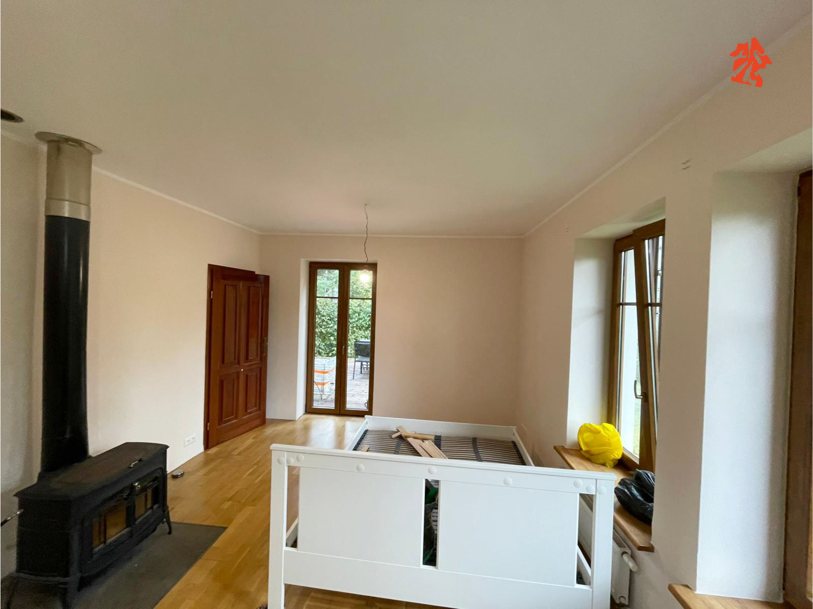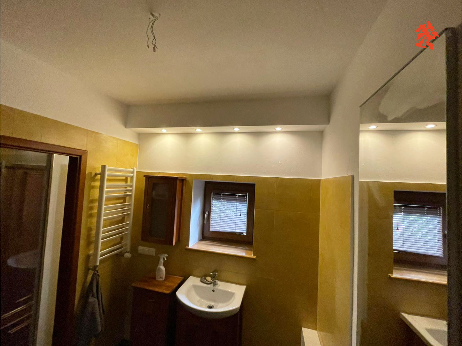 Pierwszym krokiem było odświeżenie salonu z dużą biblioteczką. To pomieszczenie ma wyjątkowy klimat dzięki drewnianym belkom na suficie, przeszklonym drzwiom tarasowym i imponującej ścianie z książkami. W ramach prac wykonaliśmy drobne naprawy ścian, malowanie oraz wymianę oświetlenia. Zadbaliśmy o to, by światło podkreślało półki z książkami – ciepła barwa LED-ów pięknie wydobywa kolory opraw i tworzy przyjemną, kameralną atmosferę. Drewniane elementy konstrukcyjne zostały oczyszczone i zabezpieczone, co pozwoliło zachować ich naturalny urok. Parkiet został odświeżony i zaolejowany, dzięki czemu nabrał głębi i ponownie stał się ozdobą wnętrza.