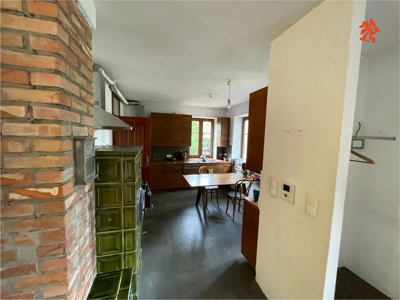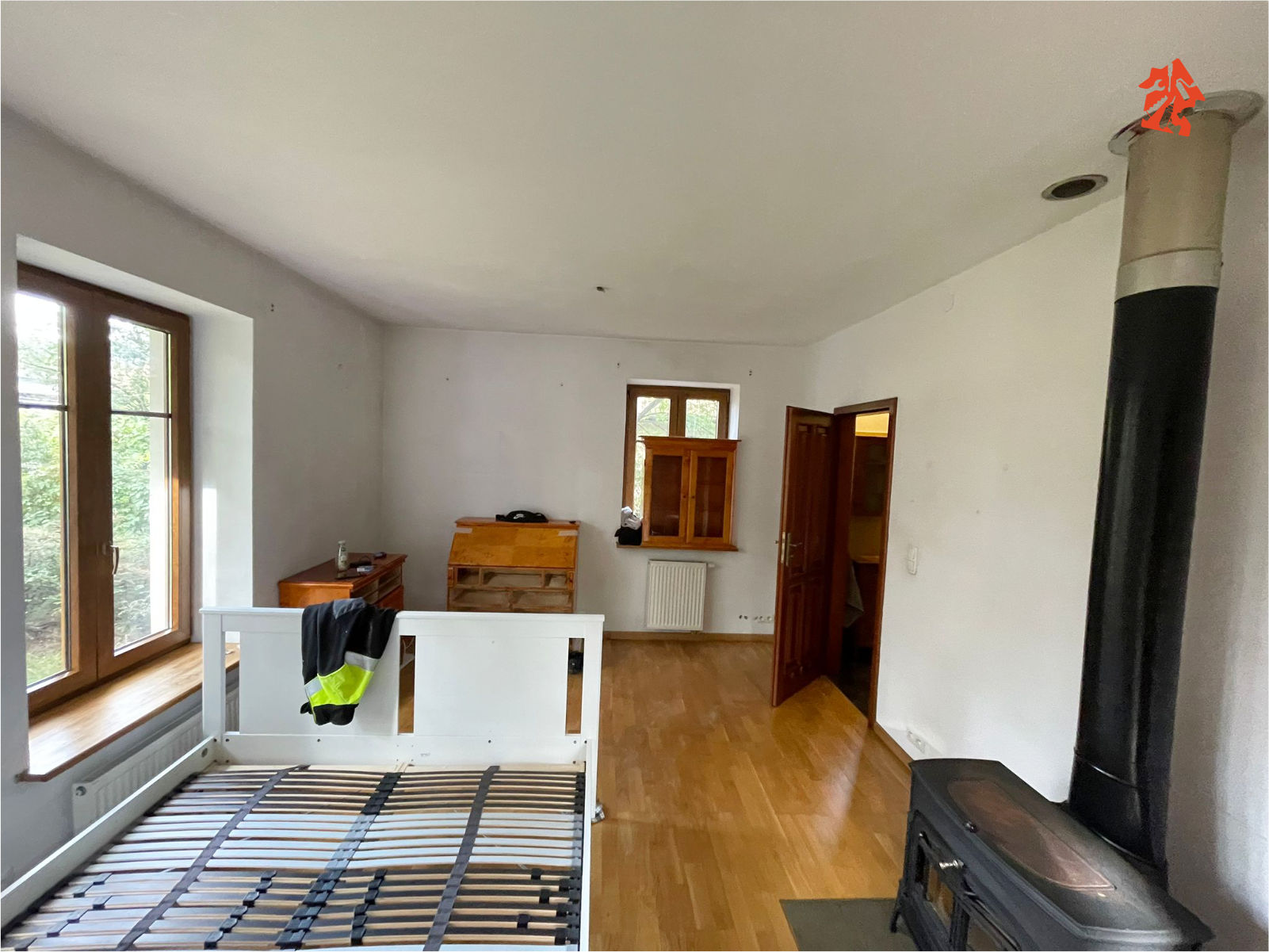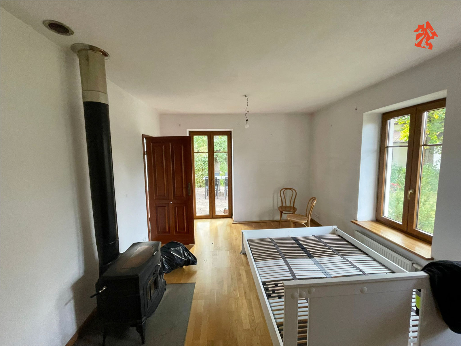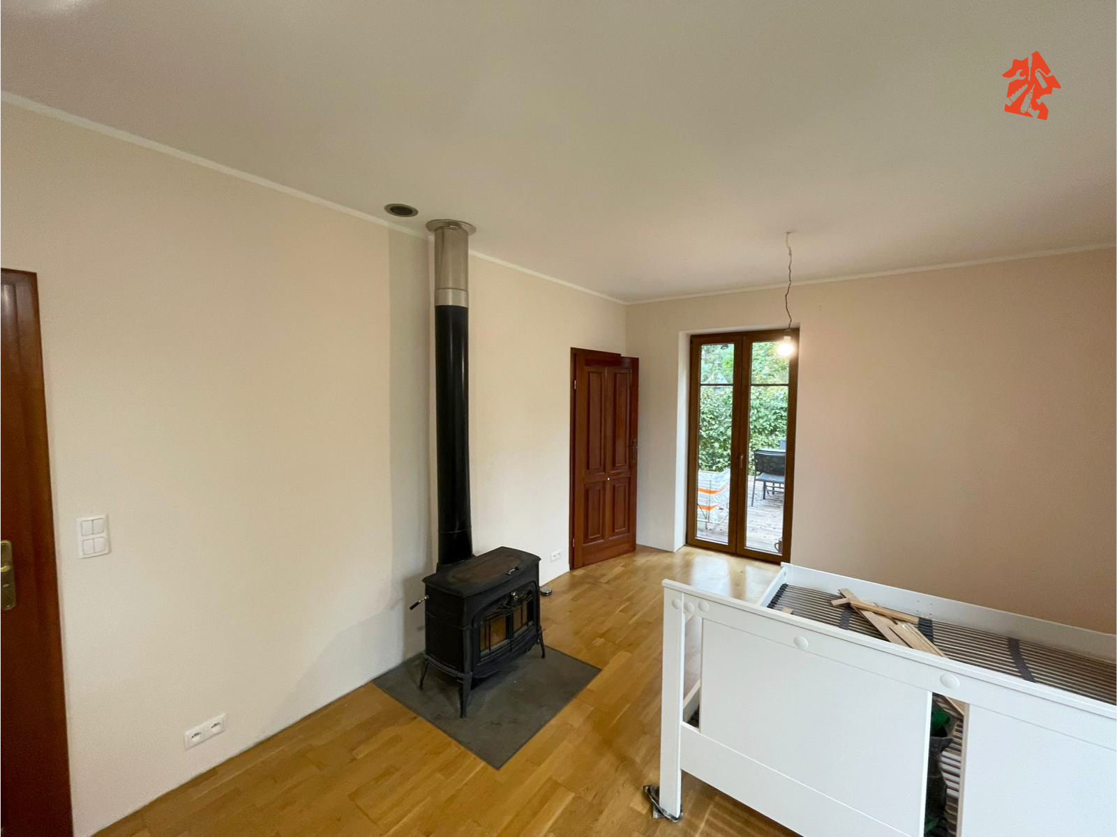 W kolejnym etapie zajęliśmy się pomieszczeniem z kominkiem. Stara koza, mimo upływu lat, wciąż świetnie spełnia swoją funkcję – wystarczyło ją dokładnie oczyścić i odświeżyć ścianę wokół. Nowe, jaśniejsze tło sprawiło, że wnętrze wydaje się przestronniejsze i bardziej uporządkowane. Drewniane drzwi oraz podłoga zostały przeszlifowane i pokryte nową warstwą lakieru, co przywróciło im blask i podkreśliło naturalne usłojenie.