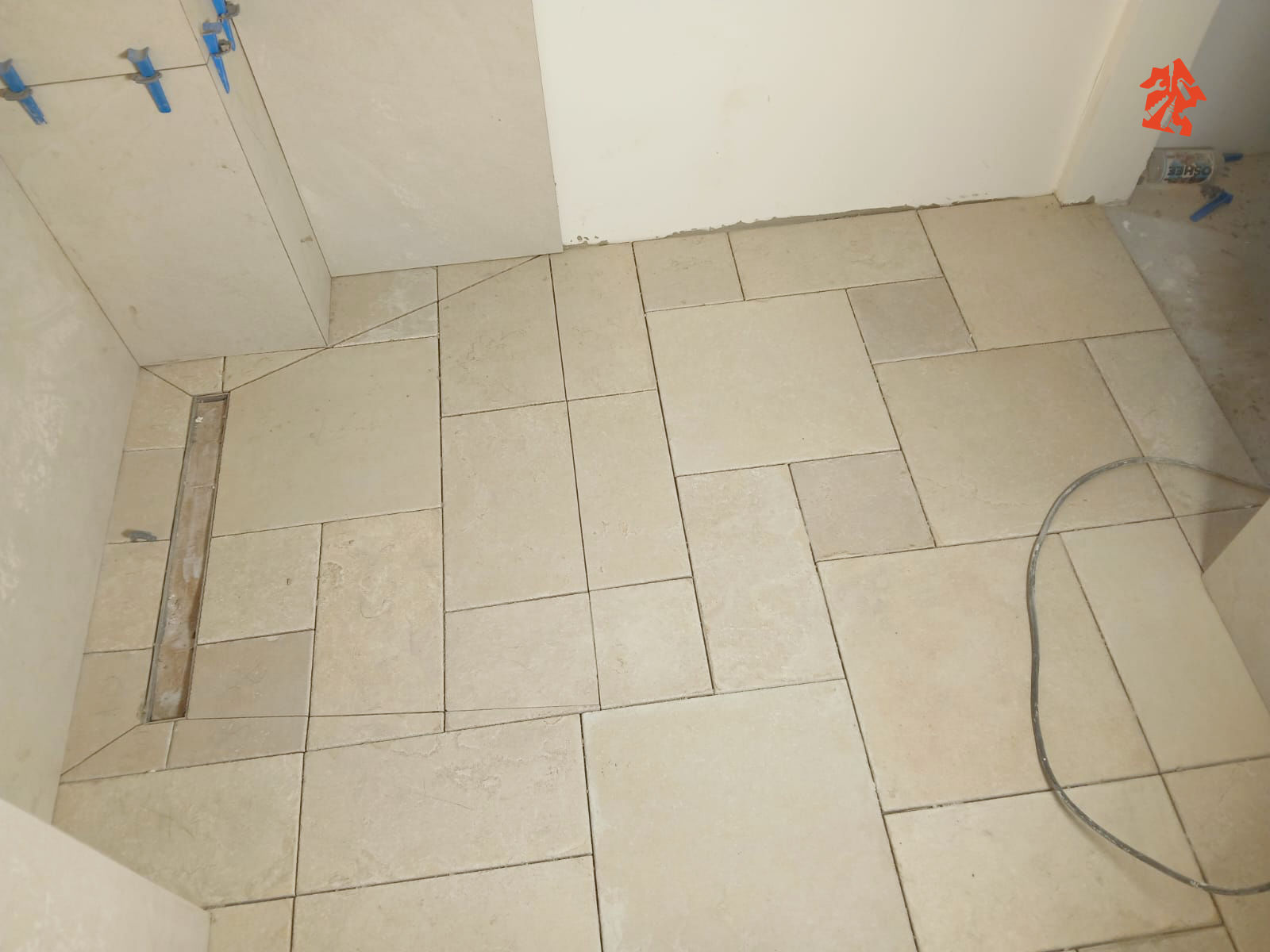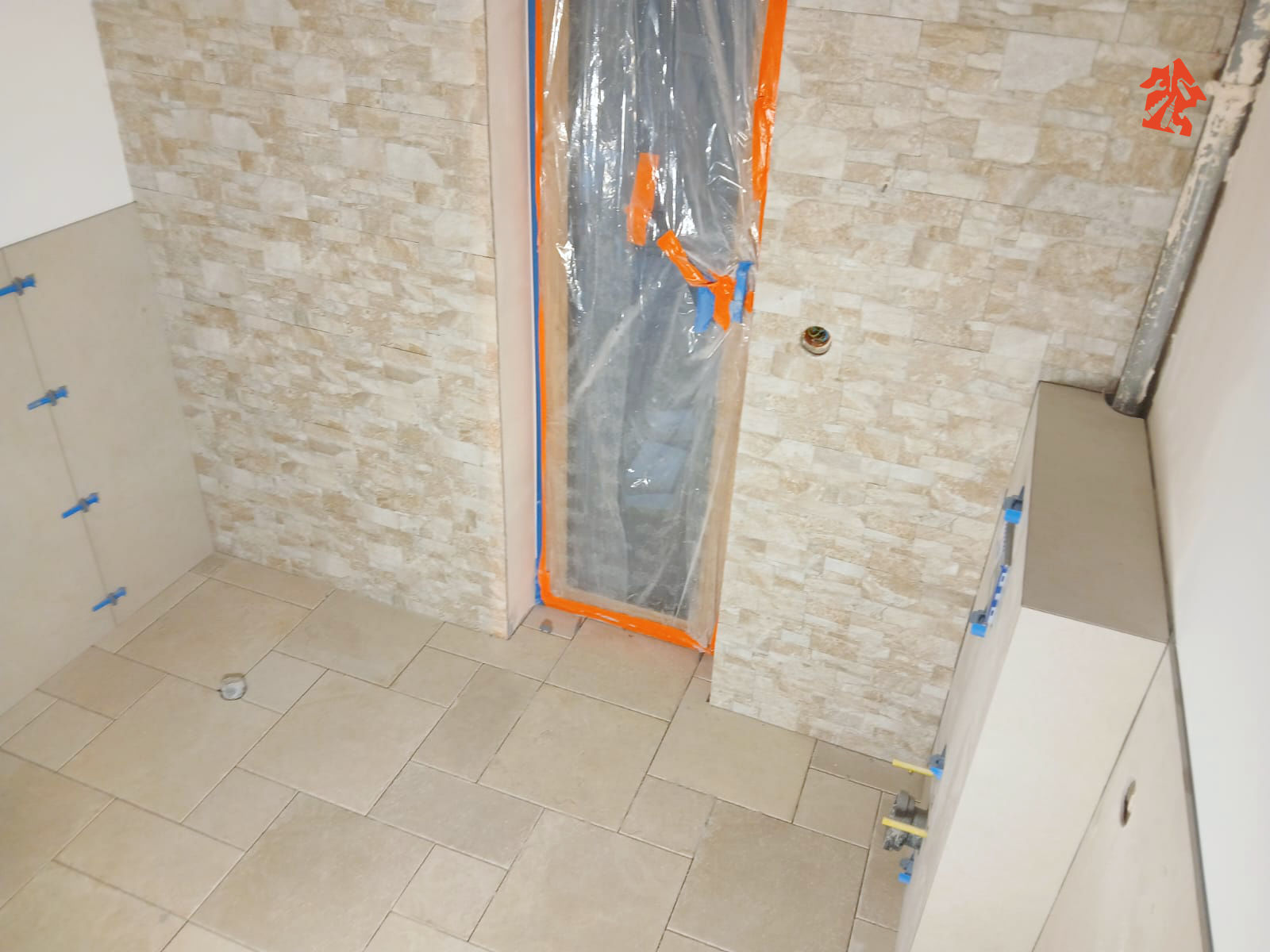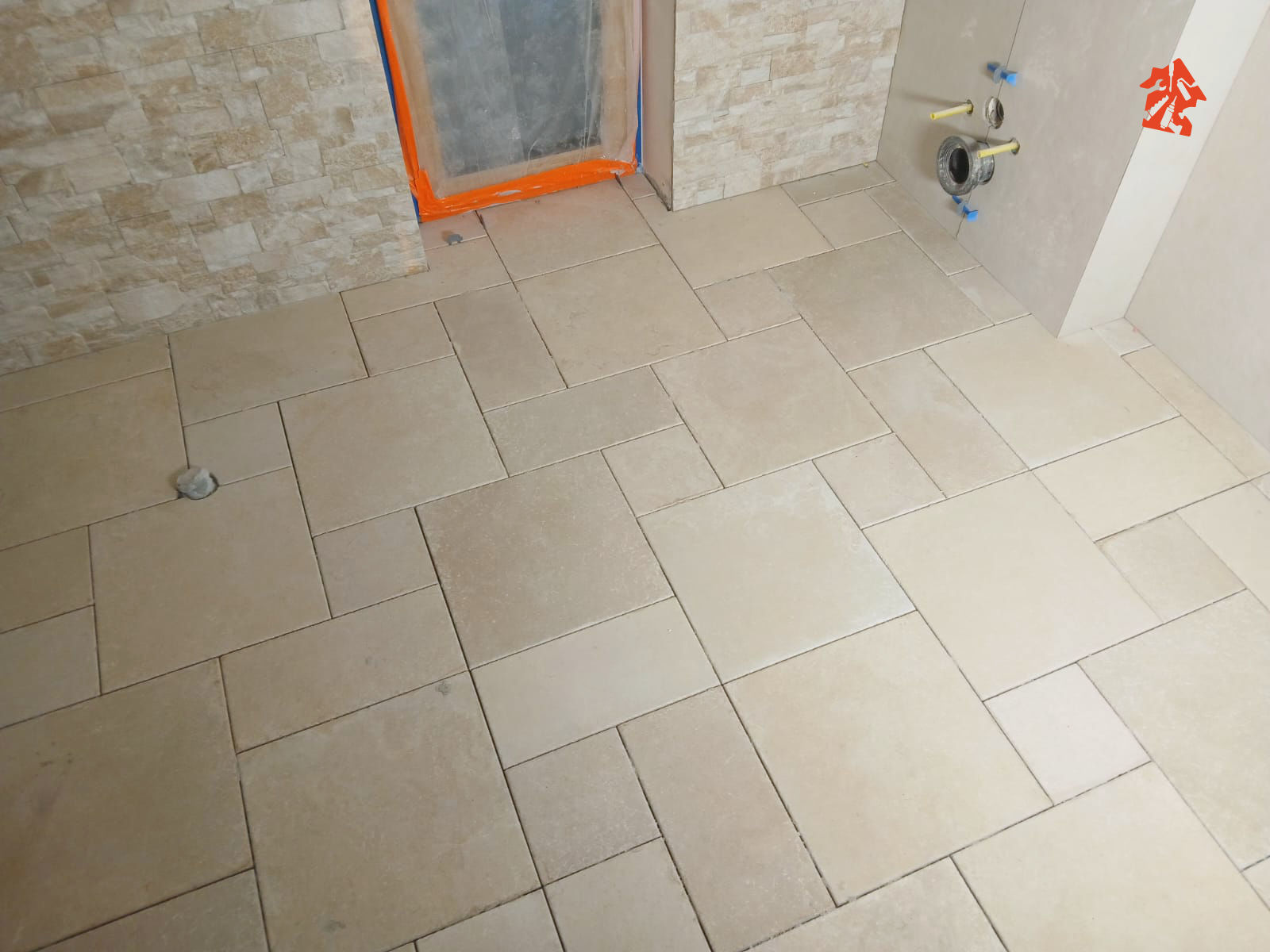 Ściany nie były dla nas czymś nowym czy zaskakującym w przeciwieństwie do podłóg. Tu mamy aż 3 rozmiary płytek, 2 w kształcie kwadratu i jedną prostokątną. Bardzo ciekawy układ, bez dokładnego rozrysowania która płytka w którym miejscu ma się dokładnie znaleźć wyszło by lekko mówiąc nieestetycznie. Przed położeniem mieliśmy dokładnie rozrysowane całe podłogi, plan został przedstawiony klientowi który go zaakceptował. Tu nie ma miejsca na pomyłkę, położenie jednej nieodpowiedniej płytki skutkuje skuciem dużej powierzchni - jak nie całej.