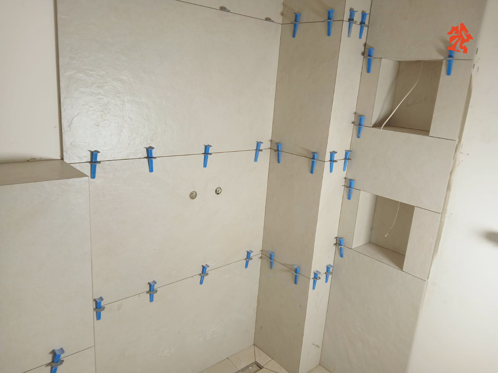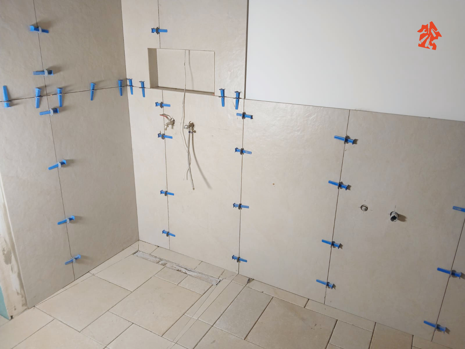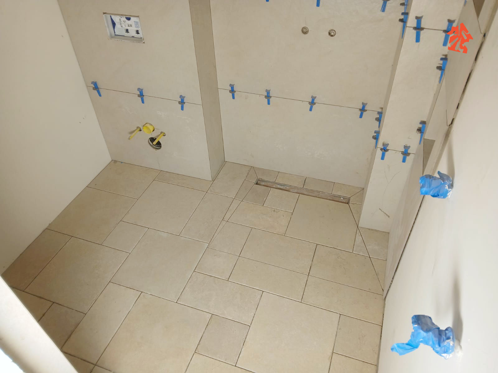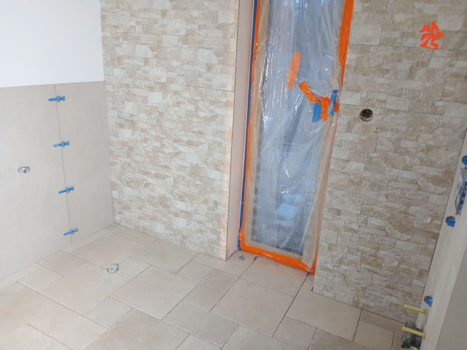 Ściany nie były dla nas czymś nowym czy zaskakującym w przeciwieństwie do podłóg. Tu mamy aż 3 rozmiary płytek, 2 w kształcie kwadratu i jedną prostokątną. Bardzo ciekawy układ, bez dokładnego rozrysowania która płytka w którym miejscu ma się dokładnie znaleźć wyszło by lekko mówiąc nieestetycznie. Przed położeniem mieliśmy dokładnie rozrysowane całe podłogi, plan został przedstawiony klientowi który go zaakceptował. Tu nie ma miejsca na pomyłkę, położenie jednej nieodpowiedniej płytki skutkuje skuciem dużej powierzchni - jak nie całej.