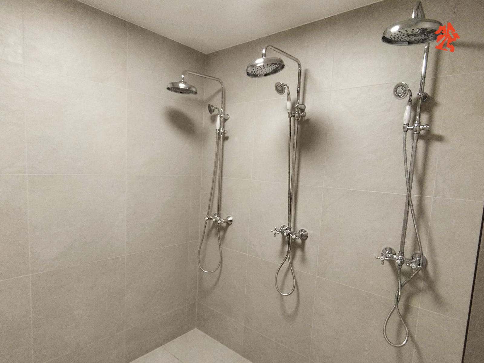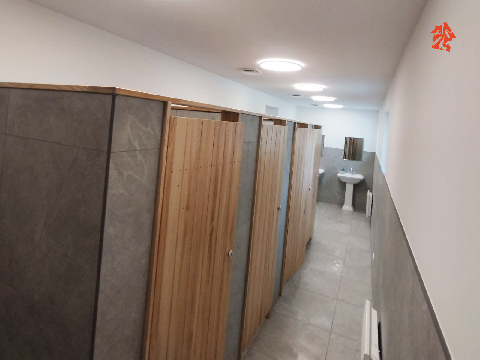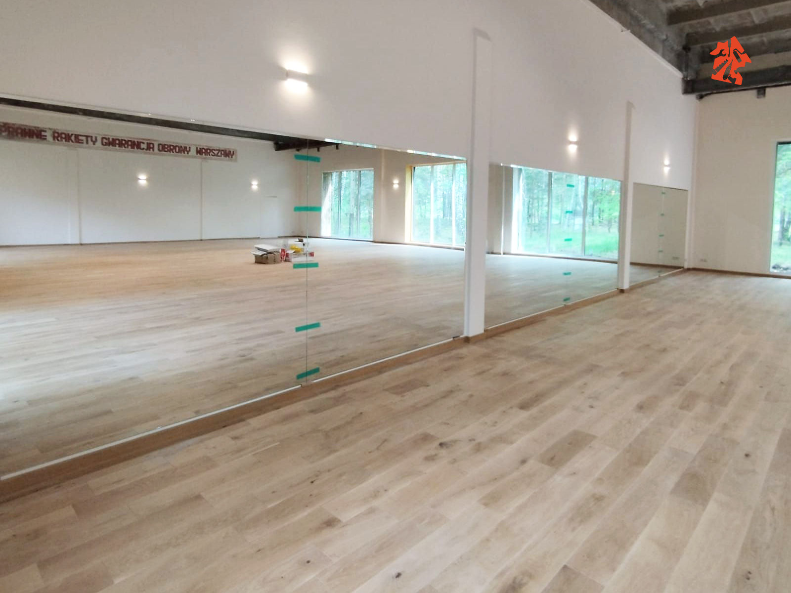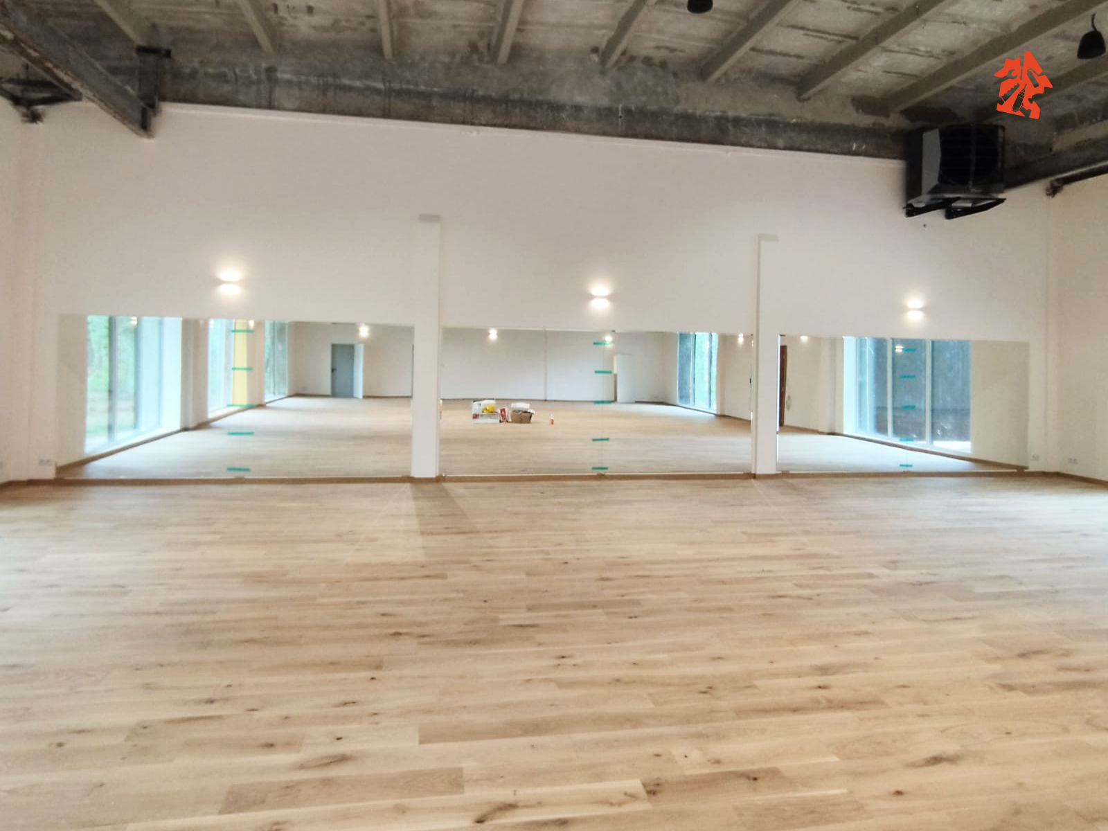 Dla zachowania walorów historycznych klient zostawił napis na ścianie: "Sprawne rakiety gwarancją obrony Warszawy". Dodatkowo została suwnica pod sufitem 🏗️. Ze względu na dużą powierzchnię oraz planowaną ilość ćwiczących rumbę, salsę, tango i inne tańce łazienki też muszą być do tego typu obiektu dostosowane. Dlatego też jest sporo kabin, natrysków oraz szafek. Projekt zamknięty, my i klient zadowoleni👍😍