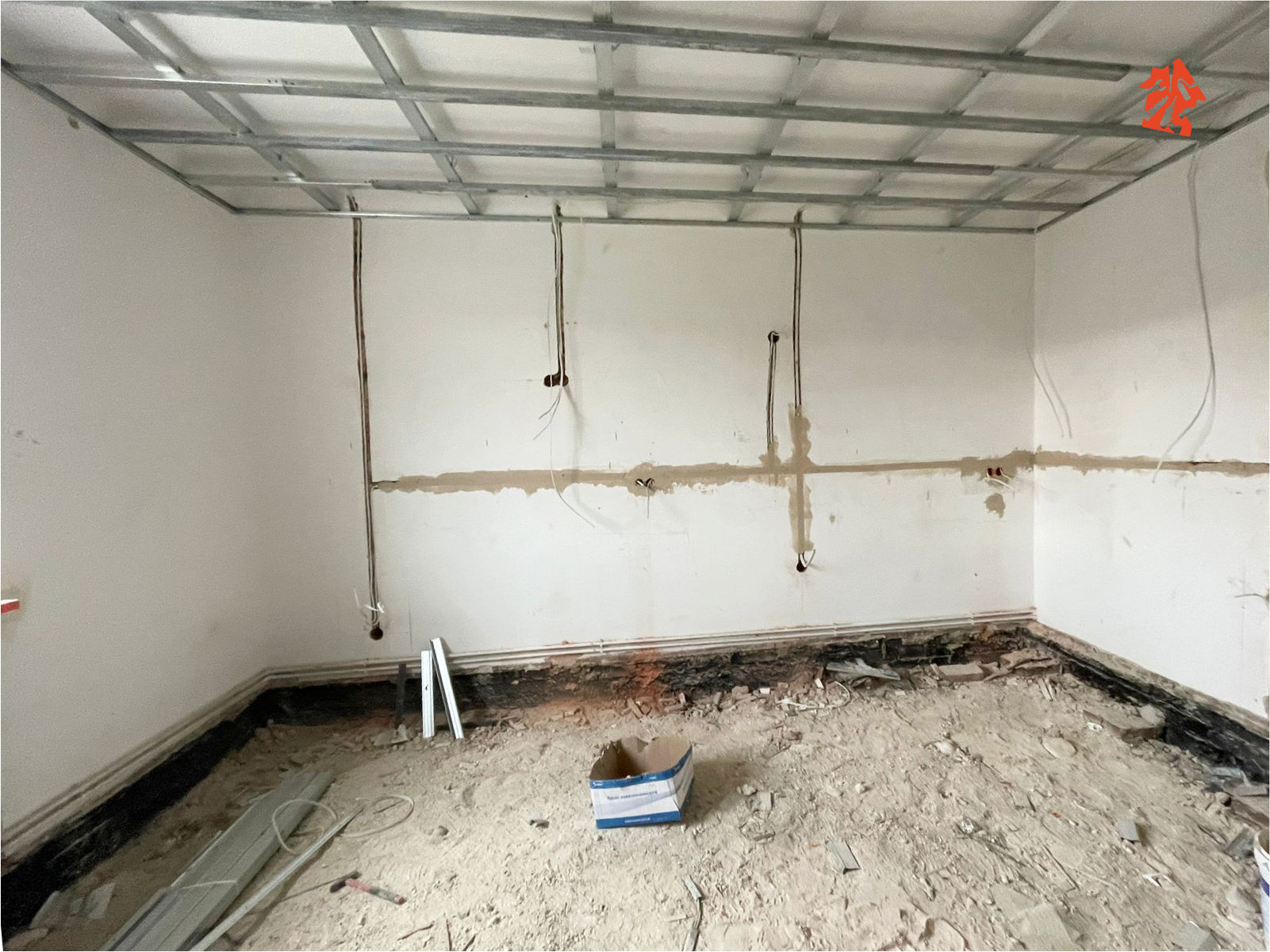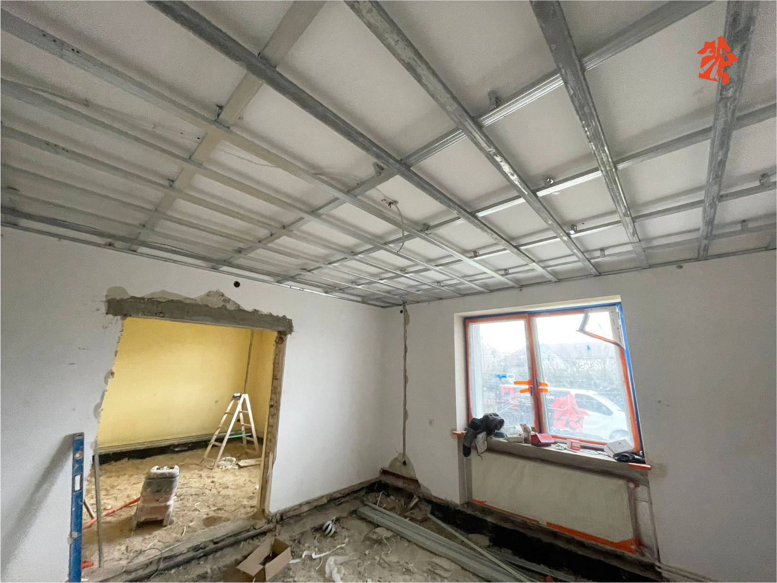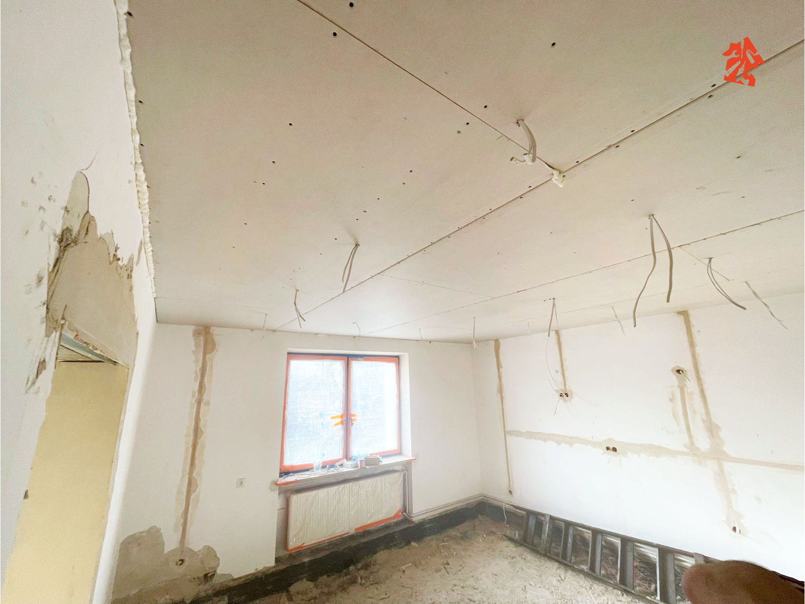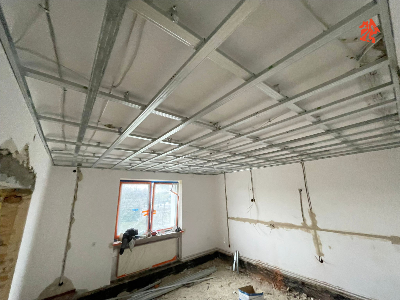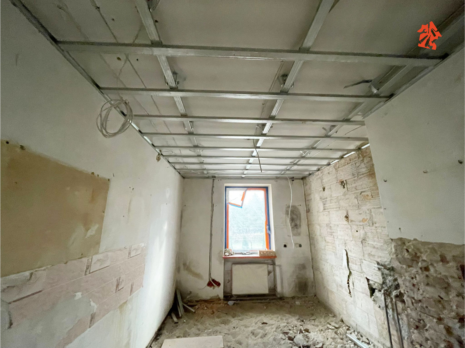 W pokojach i w kuchni stelaże pod płyty G-K na sufitach już zamontowane, pod nimi oczywiście nowiutka instalacja elektryczna. Sporo pracy miał nasz elektryk, musiał położyć praktycznie całą nową instalację w całym budynku, ale teraz za to będzie bezpiecznie i bez strachu, że gdzieś coś może się wydarzyć niedobrego.