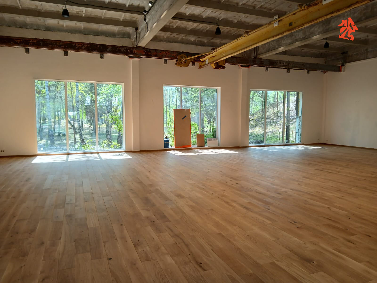 Przede wszystkim ogromna powierzchnia sali tanecznej w której położyliśmy podłogę drewnianą odporną na bardzo wysokie użytkowanie. Zwykłe panele nie przetrwałyby pewnie nawet miesiąca.