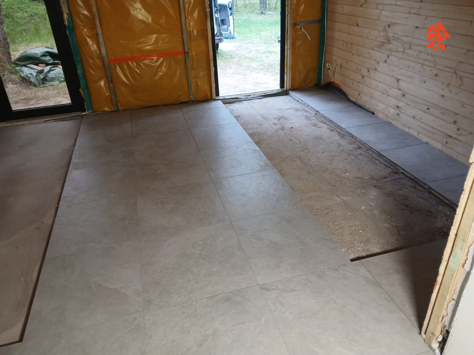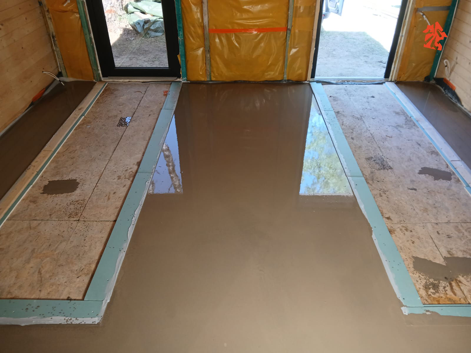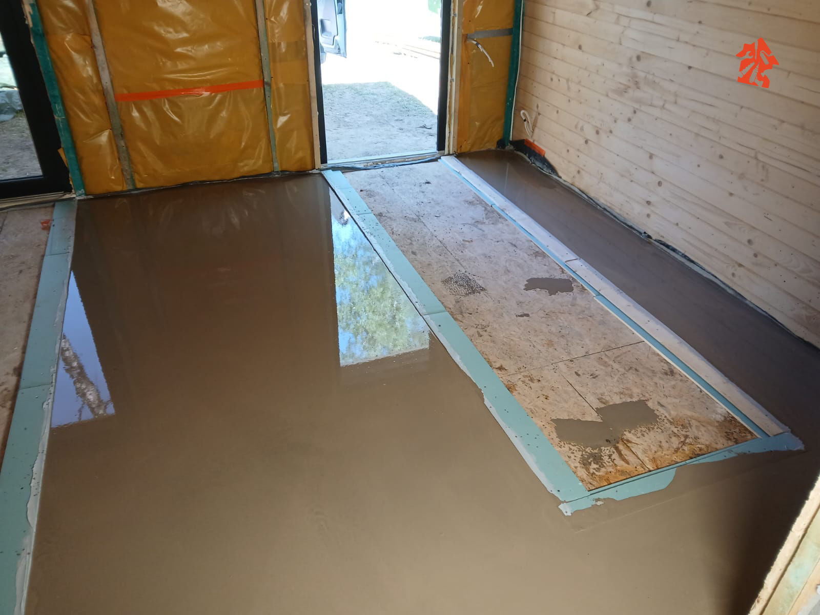 Przy wejściu możecie zobaczyć jak robimy wylewkę samopoziomującą, w tym fragmenty wejściowe będą wykonane z innego materiału i muszą się poziomować dlatego też zostały zabezpieczone odpowiednie powierzchnie.