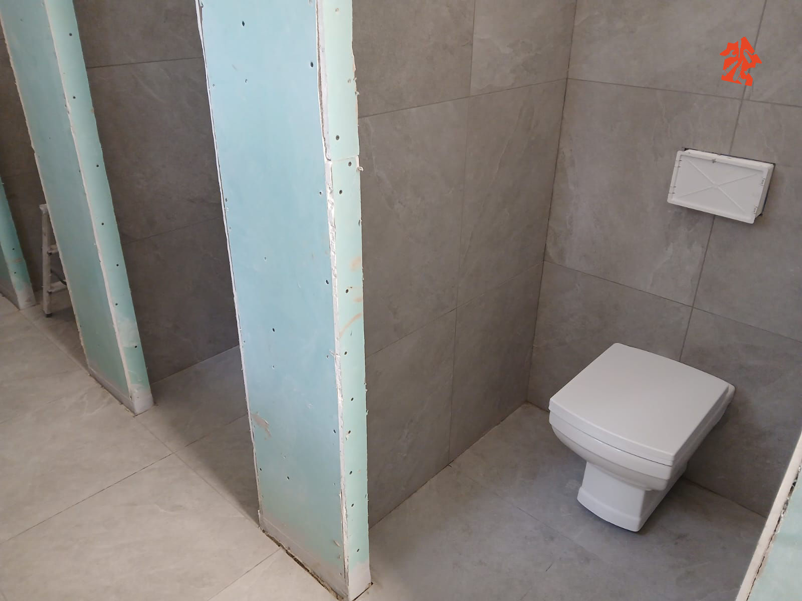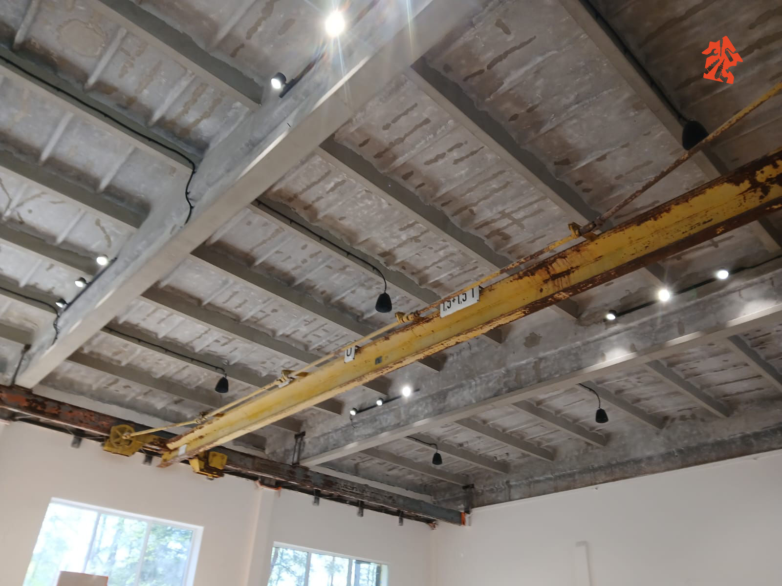 Pod sufitem widać suwnice które klient jak na razie chce zostawić jak ciekawy element wystroju. Może je do czegoś wykorzysta. Sanitariaty to kilka osobnych kabin prysznicowych, toalety, umywalki.