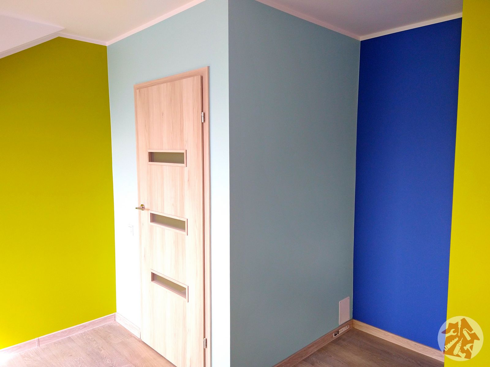 Na zdjęciach możecie zobaczyć w jaki sposób zwykłe, betonowe schody zyskują na atrakcyjności. Obudowaliśmy je fajnymi drewnianymi elementami w ciepłych kolorach i od razu zrobiło się przytulniej. Znacznie przyjemniej chodzi się boso po takich schodach, czy siedzi na nich w trakcie rozmowy, kiedy w drodze do pokoju na górze zaskoczy nas telefon od przyjaciela. Zachęcamy też abyście rzucili okiem na ściany, zróbcie to, a na pewno docenicie też atrakcyjność kolorów – pomalowanie ściany na ciemny kolor, tak, żeby nie było widać nierówności i smug to jest zadanie dla profesjonalistów, czyli dla nas.
