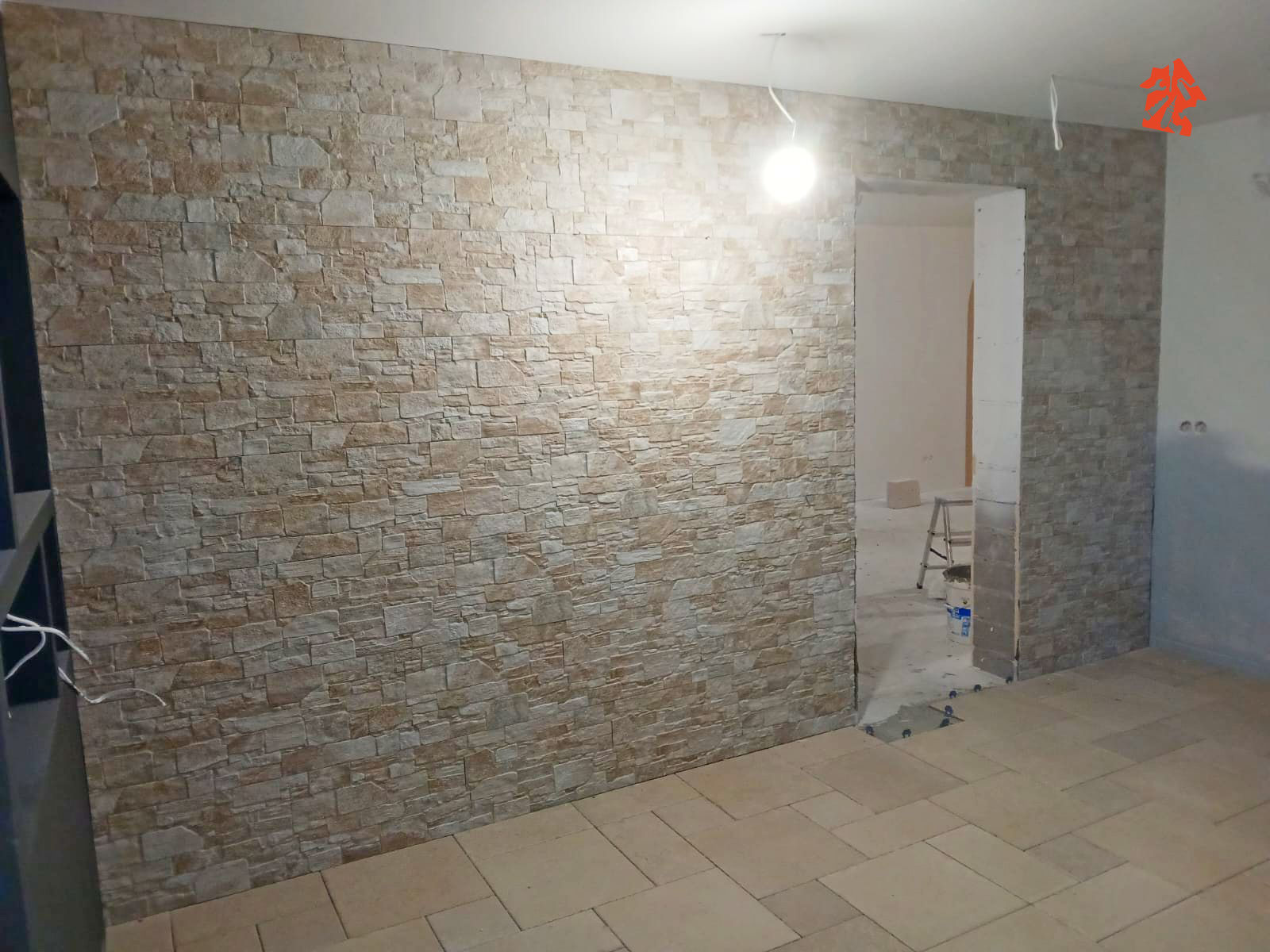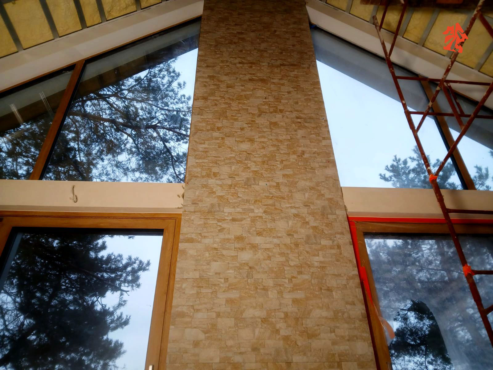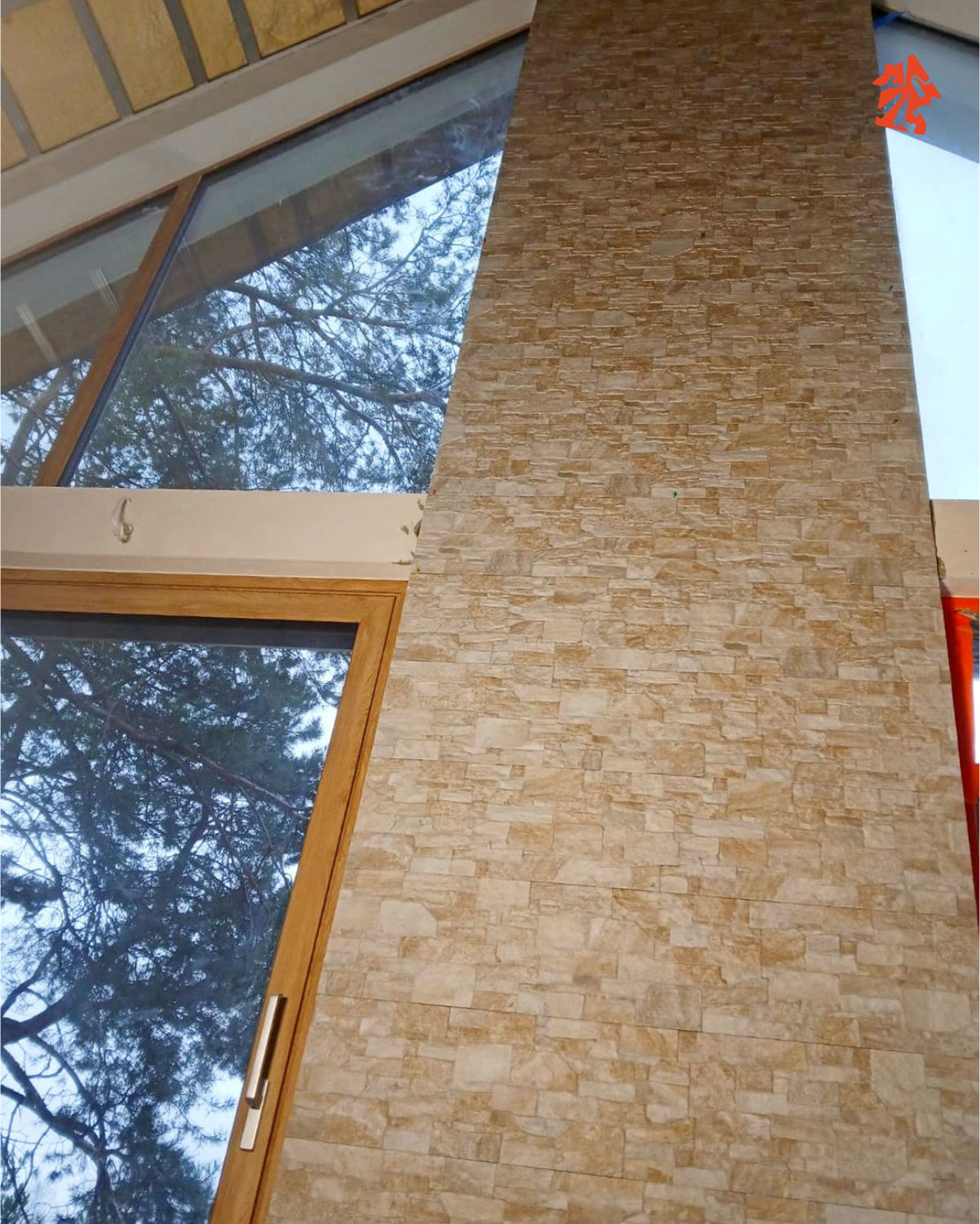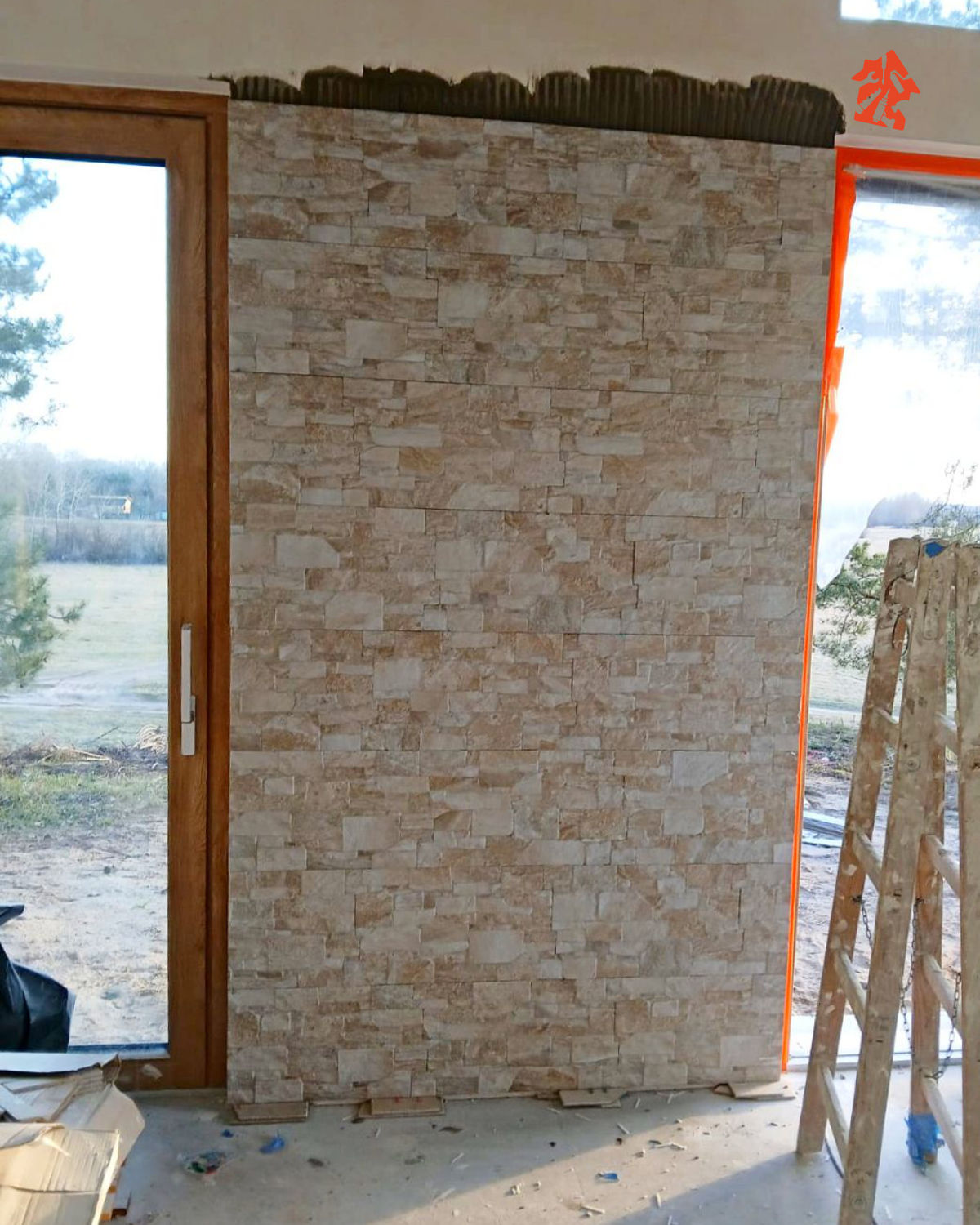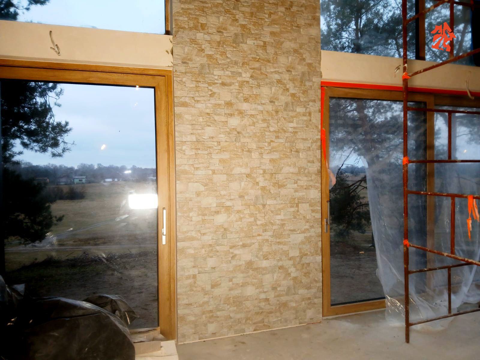 Na początek macie zdjęcia ściany wykończonej płytkami ze strukturą kamienia. Niestety nie są to płyty 60x60 cm więc praca dosyć powoli się posuwała, ale samozaparcie i systematyczność robi swoje. Jakby ktoś nie znał to te niebieskie elementy na płytkach to służą do uzyskania idealnie równej powierzchni :) Sporym wyzwaniem okazała się ściana w salonie, gdzie klient też sobie zażyczył obłożenie płytkami ze strukturą kamienia. Przy takich wysokościach to oczywiście musieliśmy zastosować rusztowanie które zresztą widać na zdjęciach. Ale efekt końcowy naprawdę robi wrażenie!!!