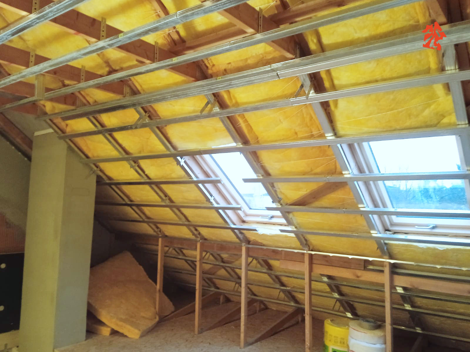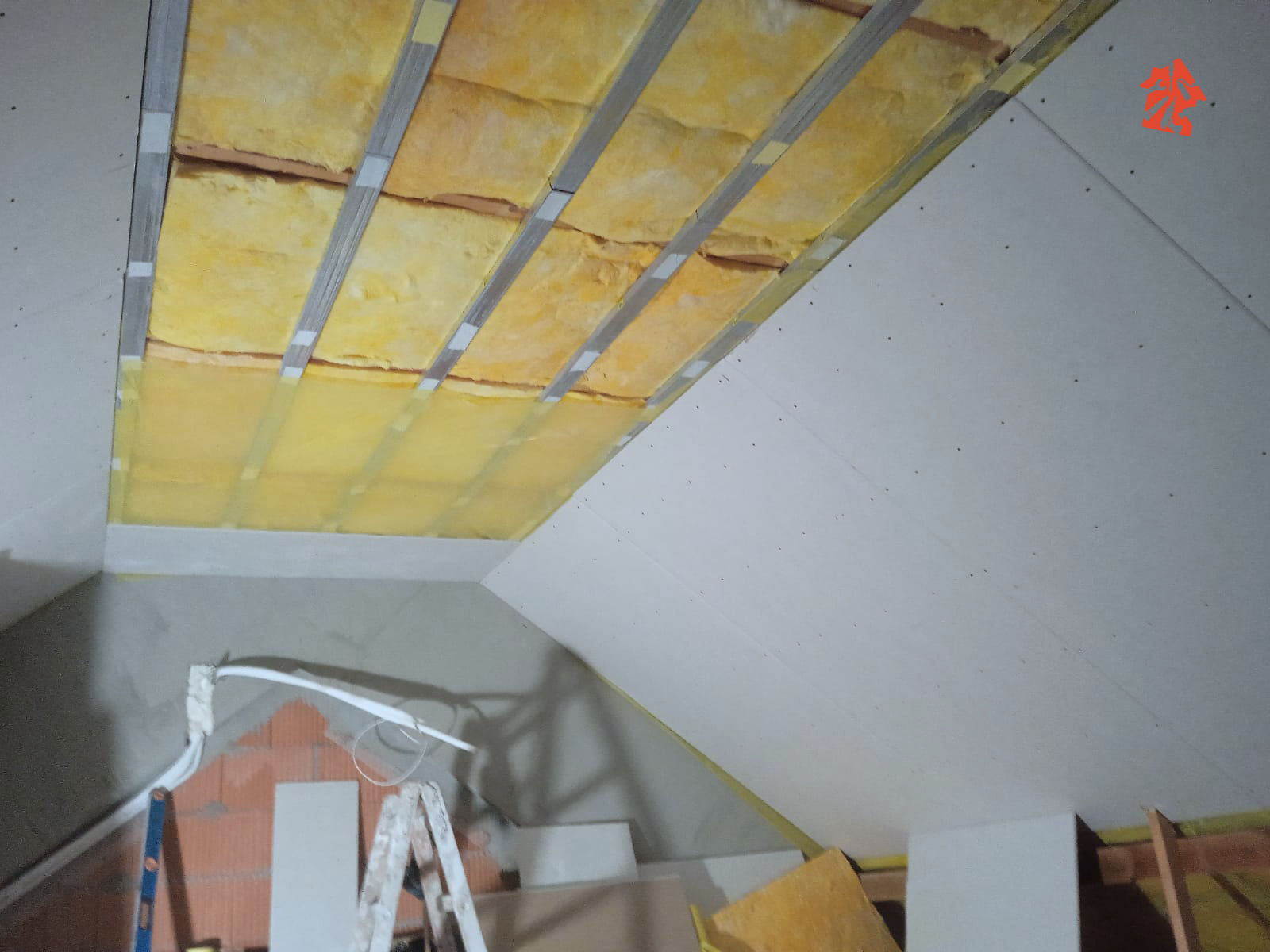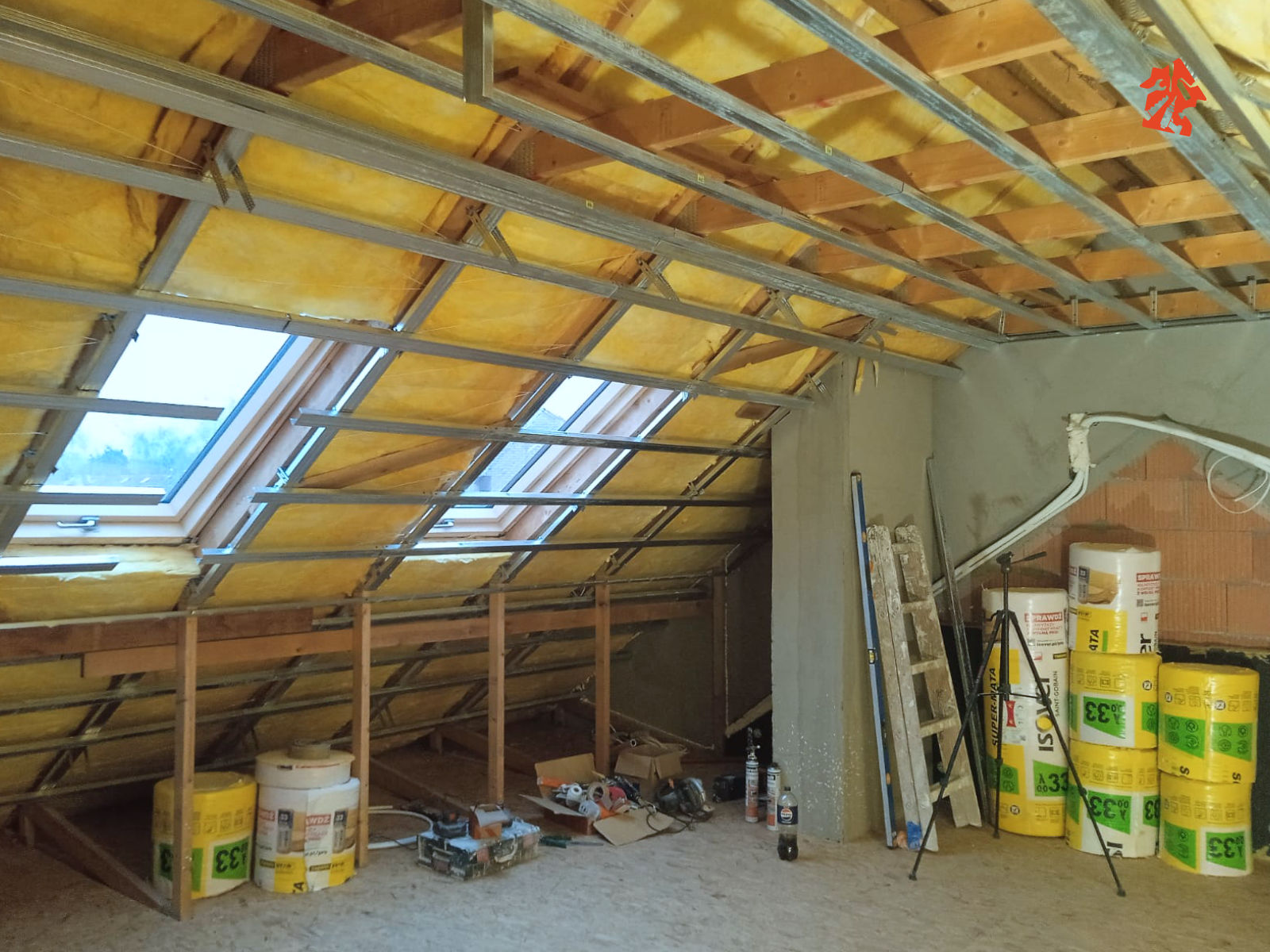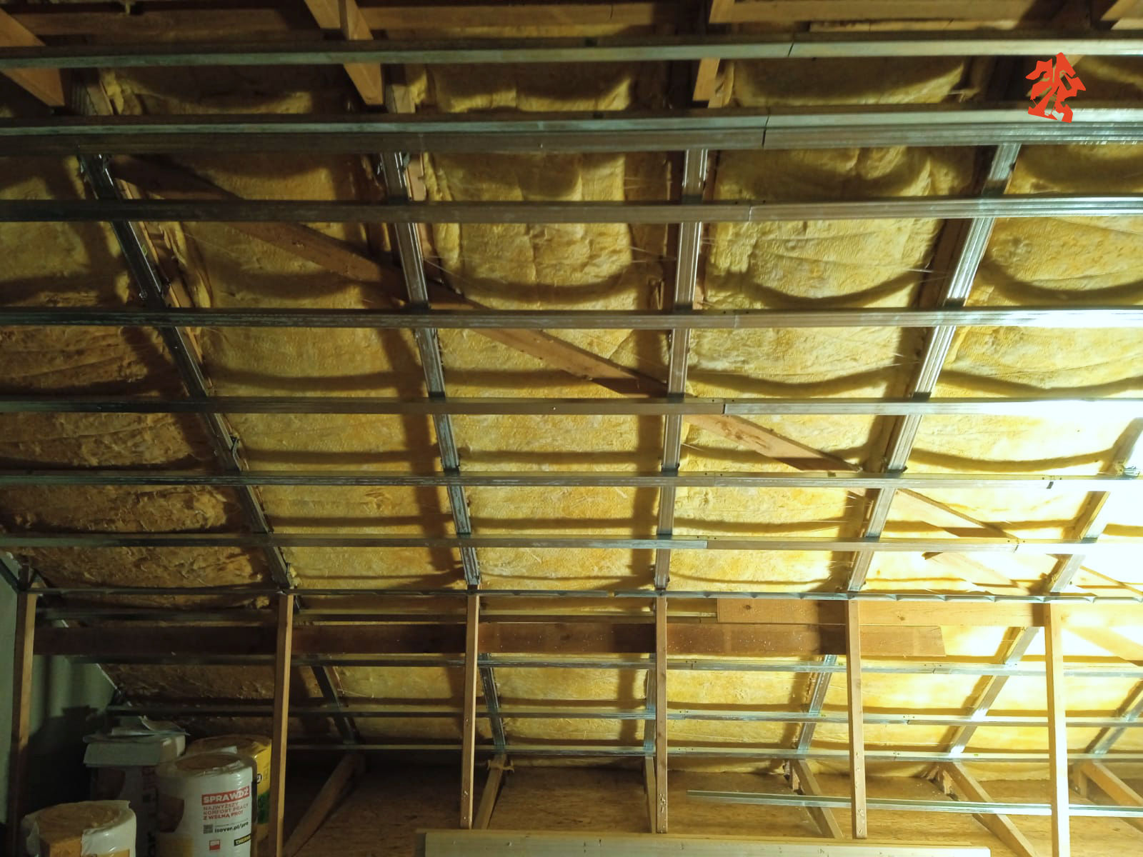 Nasza ekipa właśnie dostała plan działania w nowym domu jednorodzinnym, plan jest taki aby rozpocząć od poddasza - montujemy wełnę mineralną, do konstrukcji dachu mocujemy stelaże stalowe i przykręcamy płyty gipsowo-kartonowe.