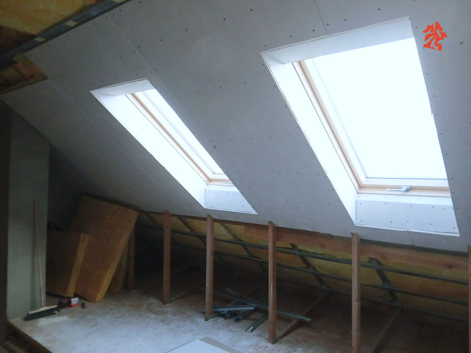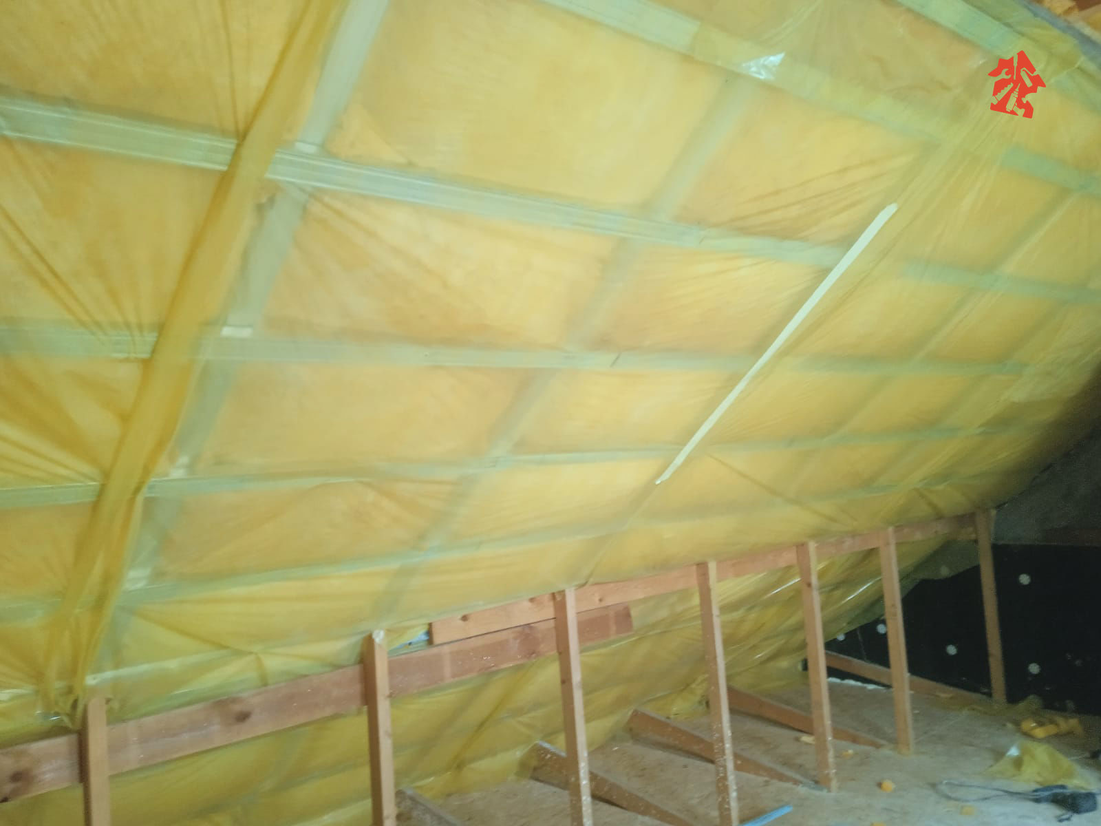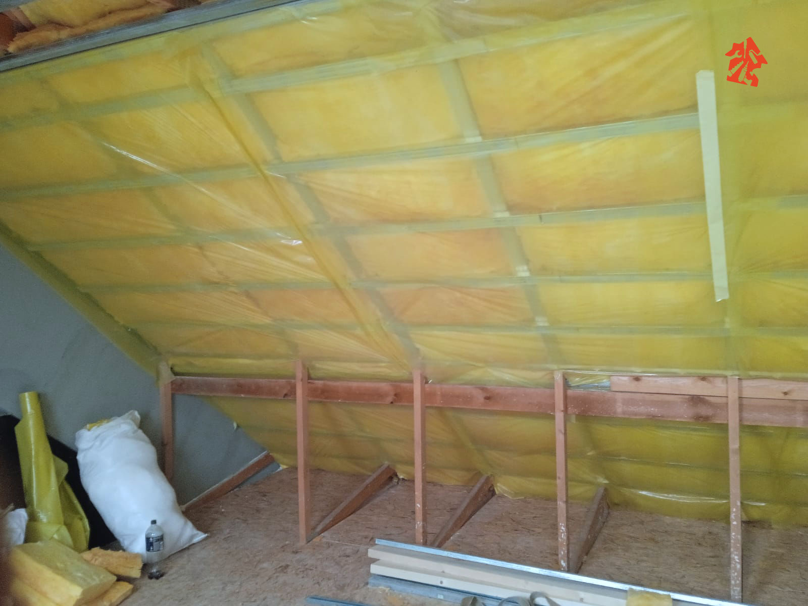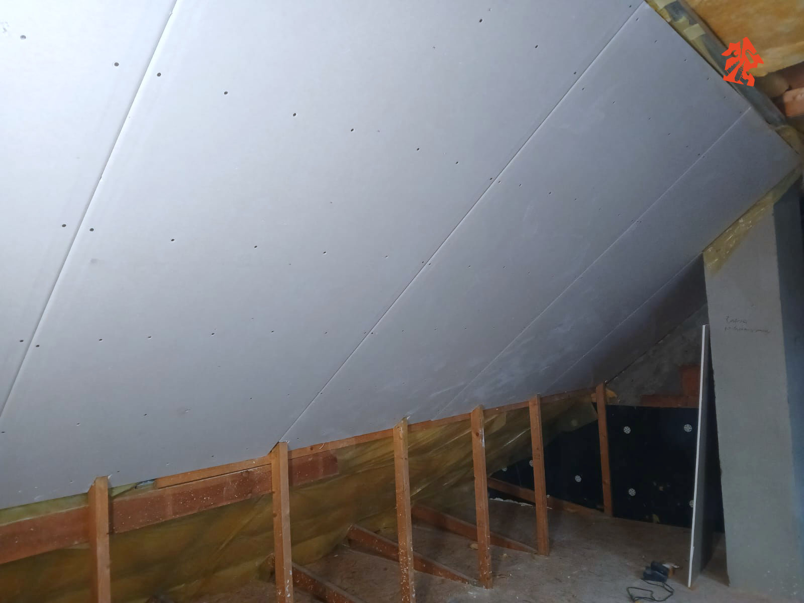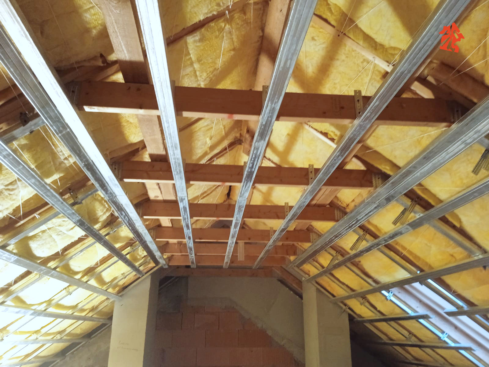Nasza ekipa właśnie dostała plan działania w nowym domu jednorodzinnym, plan jest taki aby rozpocząć od poddasza - montujemy wełnę mineralną, do konstrukcji dachu mocujemy stelaże stalowe i przykręcamy płyty gipsowo-kartonowe.